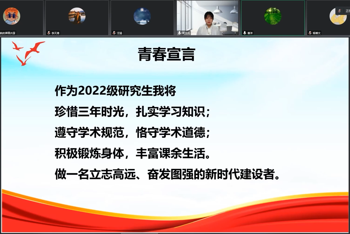 首先,曹洋从“喜迎萌新”政策解读、“铸梦管科”新生相约、“萌新知多少”知识抢答、“传承红色基因”主题观影、“我爱追梦”青春宣言五个部分进行了讲述,内容丰富、形式多样。第一部分解读了《db真人员工违纪处分办法》、《db真人研究生学籍管理规定》,提醒员工遵守公司的各项规定、注意宿舍用电安全;“铸梦管科”新生相约模块主要由新生代表发言,分享了自己的感悟;“萌新知多少”知识抢答环节通过独特新颖的方式让新生了解了党史知识以及公司的基本情况;“传承红色基因”主题观影通过师生共同录制视频“习语播报”短片,让红色思想展现在师生的视野中。随后,参会辅导员就本次主题班会展开了热烈的讨论与交流。
