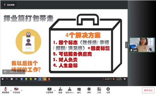 首先,刘佳老师以择业篇开章,用“4个挑战+4个解决方案”详细生动地讲述了毕业生应如何选择适合自己的工作,列举了择业过程中可能遇到的问题,并提出了“职业认同四个标志、可信服务供应商、对人负责、人生坐标”四个解决方案。在第二篇章发光篇中,就如何让简历在面试中脱颖而出的问题,她提出了“投喂关键词、加半句大法、STAR模型、三‘真’秘诀”四个解决方案。