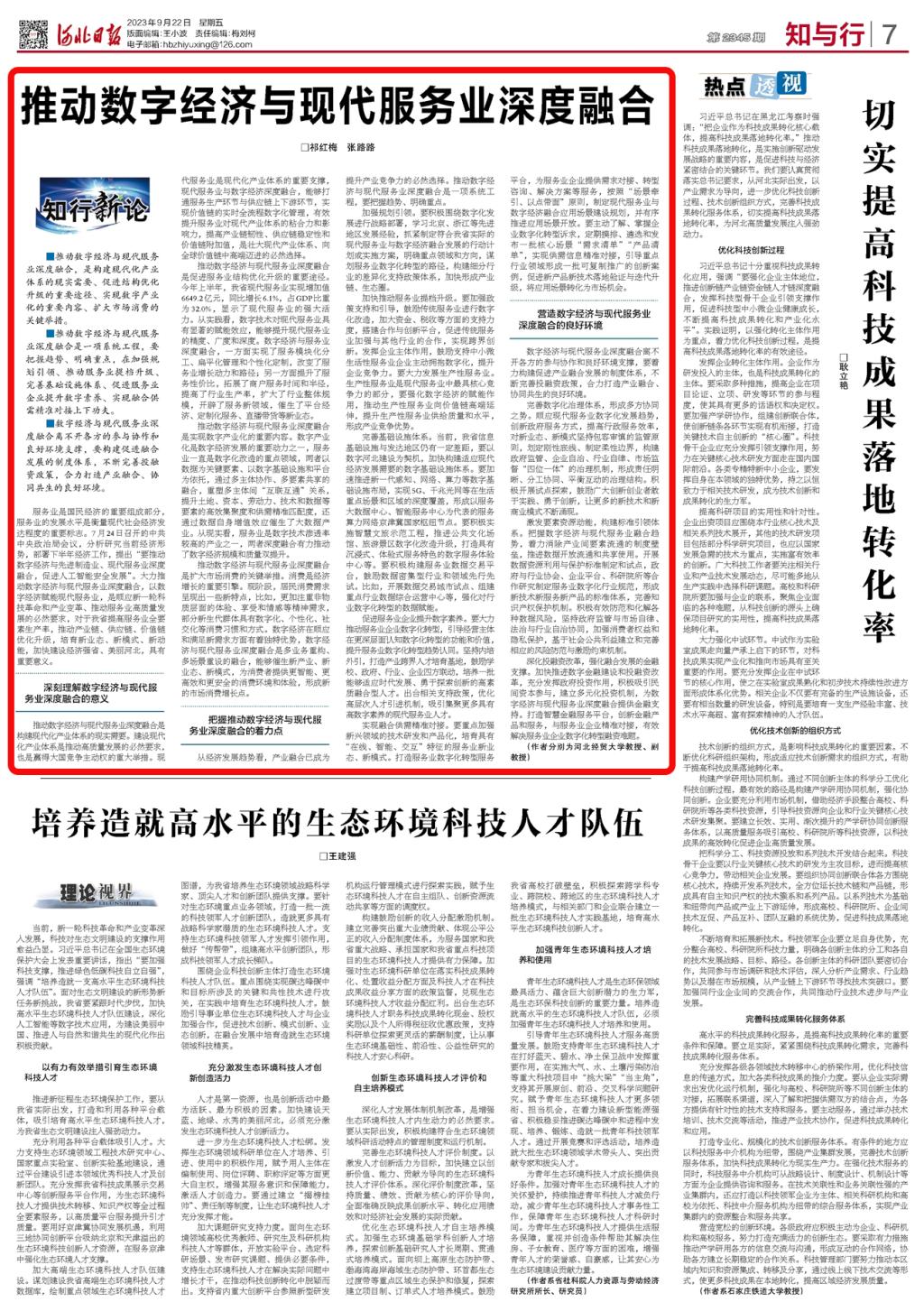 9月22日,《河北日报》知与行版刊发公司经理祁红梅教授和旅游公司张路路副教授联合署名文章《推动数字经济与现代服务业深度融合》。原文图片及报道链接如下: