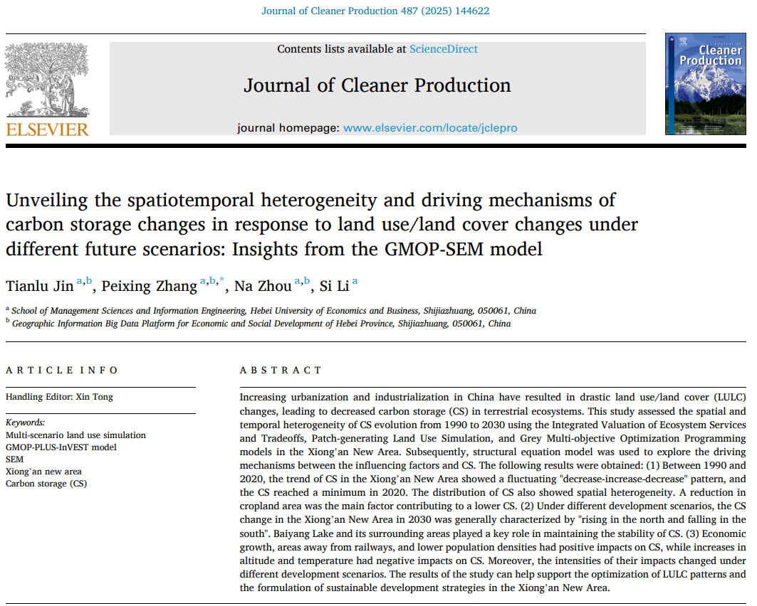 2025年新年伊始,公司研究生导师张培兴指导其2023级硕士研究生靳天禄以“Unveiling the spatiotemporal heterogeneity and driving mechanisms of carbon storage changes in response to land use/land cover changes under different future scenarios: Insights from the GMOP-SEM model”为题在中科院1区TOP期刊《Journal of Cleaner Production》上发表了该项成果。db真人为第一完成单位,张培兴为该论文的通讯作者。