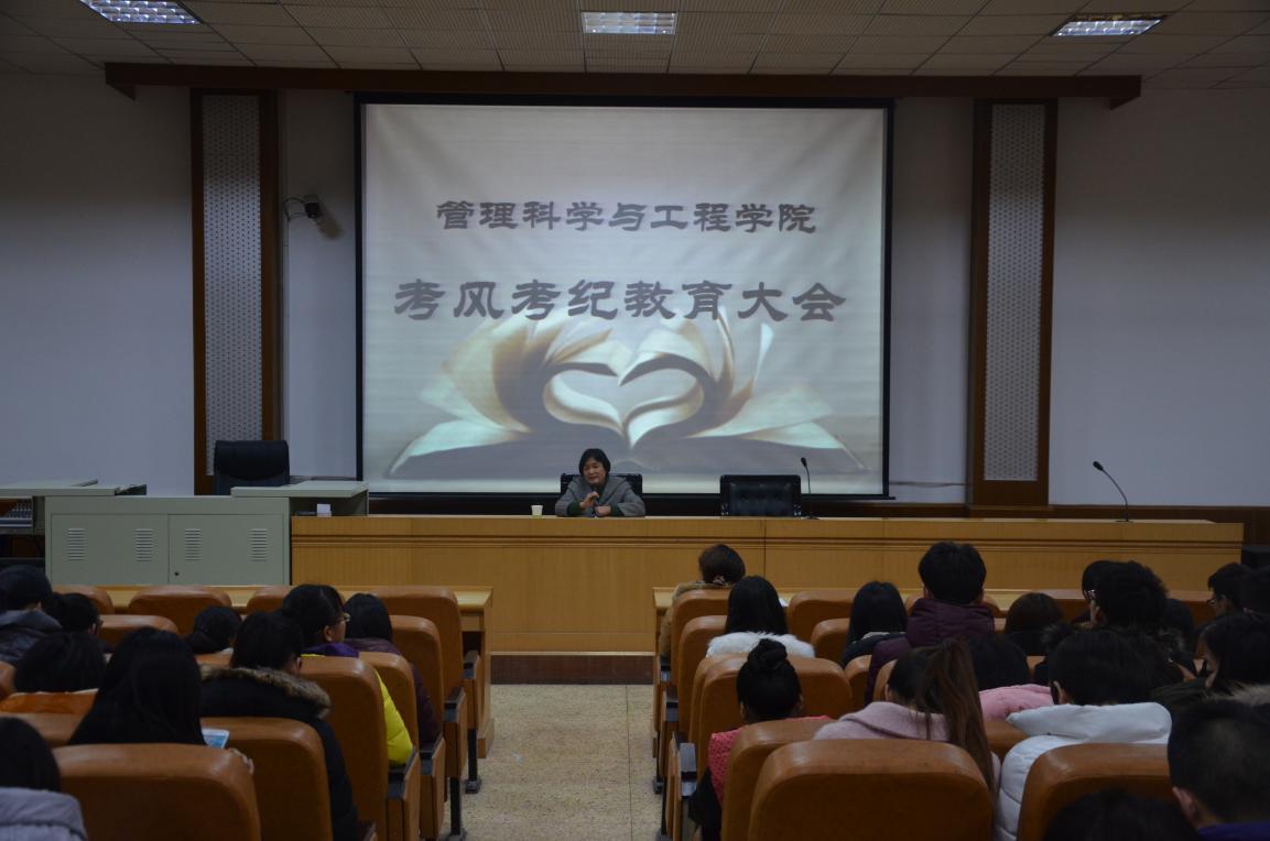 为严肃考风考纪,加强诚信教育,杜绝考试作弊现象,12月29日,管理科学与工程公司于第三教学楼C201教室召开考风考纪教育大会,公司副经理许世瑛、党总支副书记张晓军共同出席此次大会,公司2013、2014级全体员工参加此次大会。